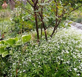Sweet woodruff plants bear clusters of small, white star-shaped blooms and reach 8″-12″ in height (with a slightly greater width). Foliage takes the form of whorls of lance-shaped, dark green leaves. Sweet woodruff prefers shade and a well-drained, slightly acidic, soil. Sweet woodruff plants will grow more vigorously with regular watering, but this will also result in their spread (perhaps to areas where they are not welcome). If you wish to keep sweet woodruff herb plants contained within a certain space, cut back on watering.